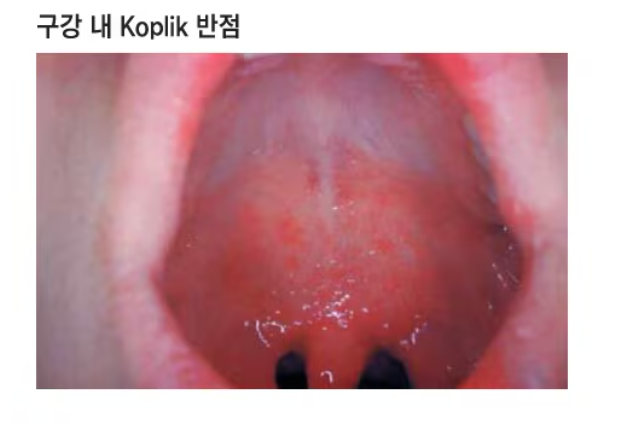 | 특징적 증상 | 미세한 붉은 발진, 피부 벗겨짐 | 코플릭 반점(입 안 흰 반점), 얼굴부터 퍼지는 발진 |